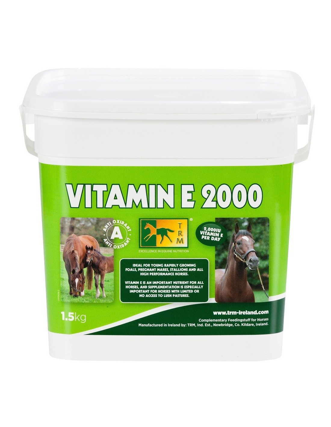 VITAMIN E 2000 è un mangime complementare per cavalli. La Vitamina E che ha un ruolo fonamentale per la fertilità. La Vitamina E è di vitale supporto per puledri, fattrici, stalloni e per cavalli impegnati in attività agonistiche.