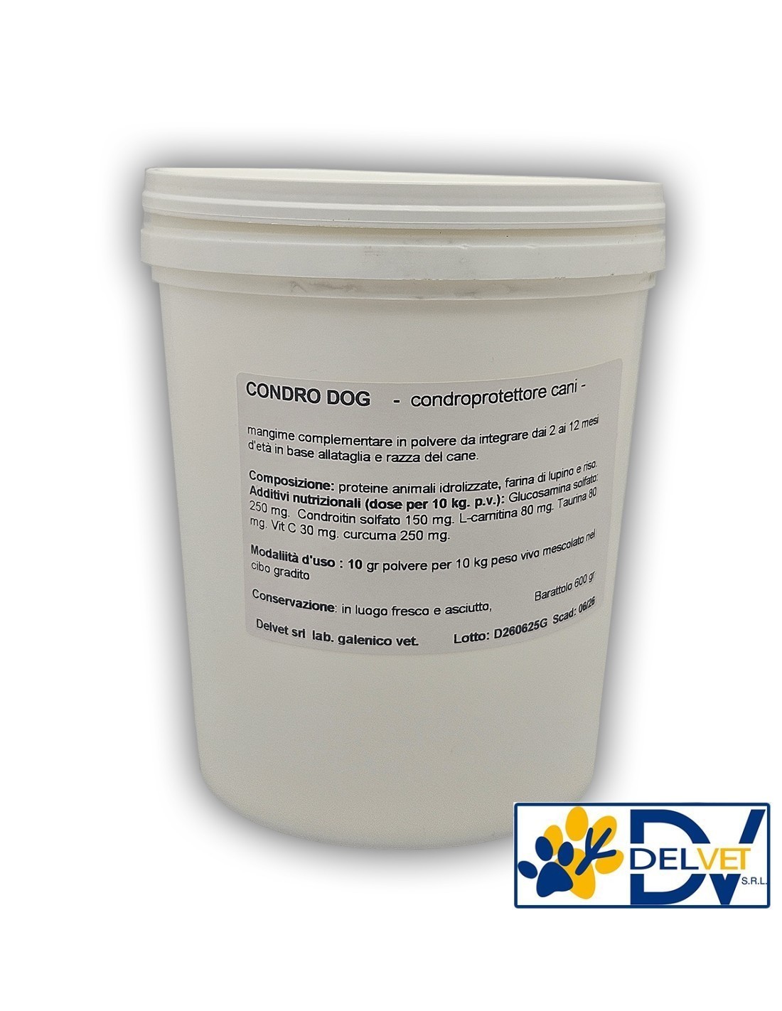 CONDRO DOG polvere 600 gr è un mangime complementare in polvere formulato per supportare lo sviluppo articolare nei cuccioli di cane, da integrare all’alimentazione quotidiana dai 2 ai 12 mesi di età, in funzione di taglia e razza.