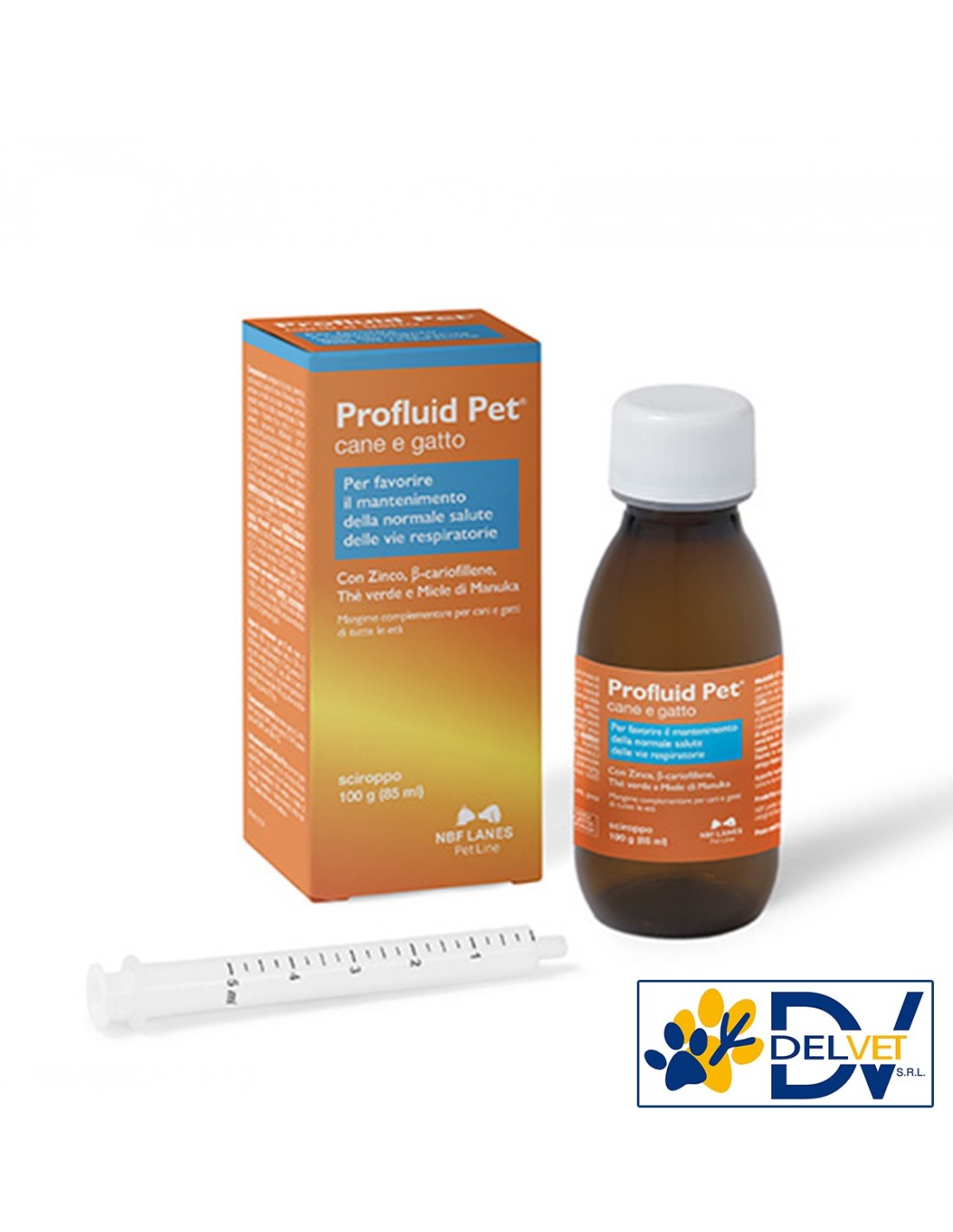 NBF LANES - PROFLUID PET SCIROPPO 85 ML è un mangime complementare per cani e gatti di tutte le età, formulato per favorire la normale salute delle vie respiratorie. Grazie alla presenza di zinco, β-cariofillene, estratto di tè verde e miele di Manuka, supporta le naturali difese dell’organismo e aiuta a mantenere in salute l’apparato respiratorio, soprattutto nei periodi critici.