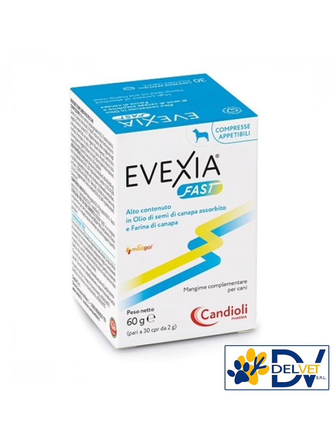 Candioli EVEXIA FAST 30 COMPRESSE da 2 GR - 60 GR è un mangime complementare in compresse per cani e gatti, formulato con alto contenuto di olio e farina di semi di canapa, ideale per supportare la funzionalità articolare e muscolare.