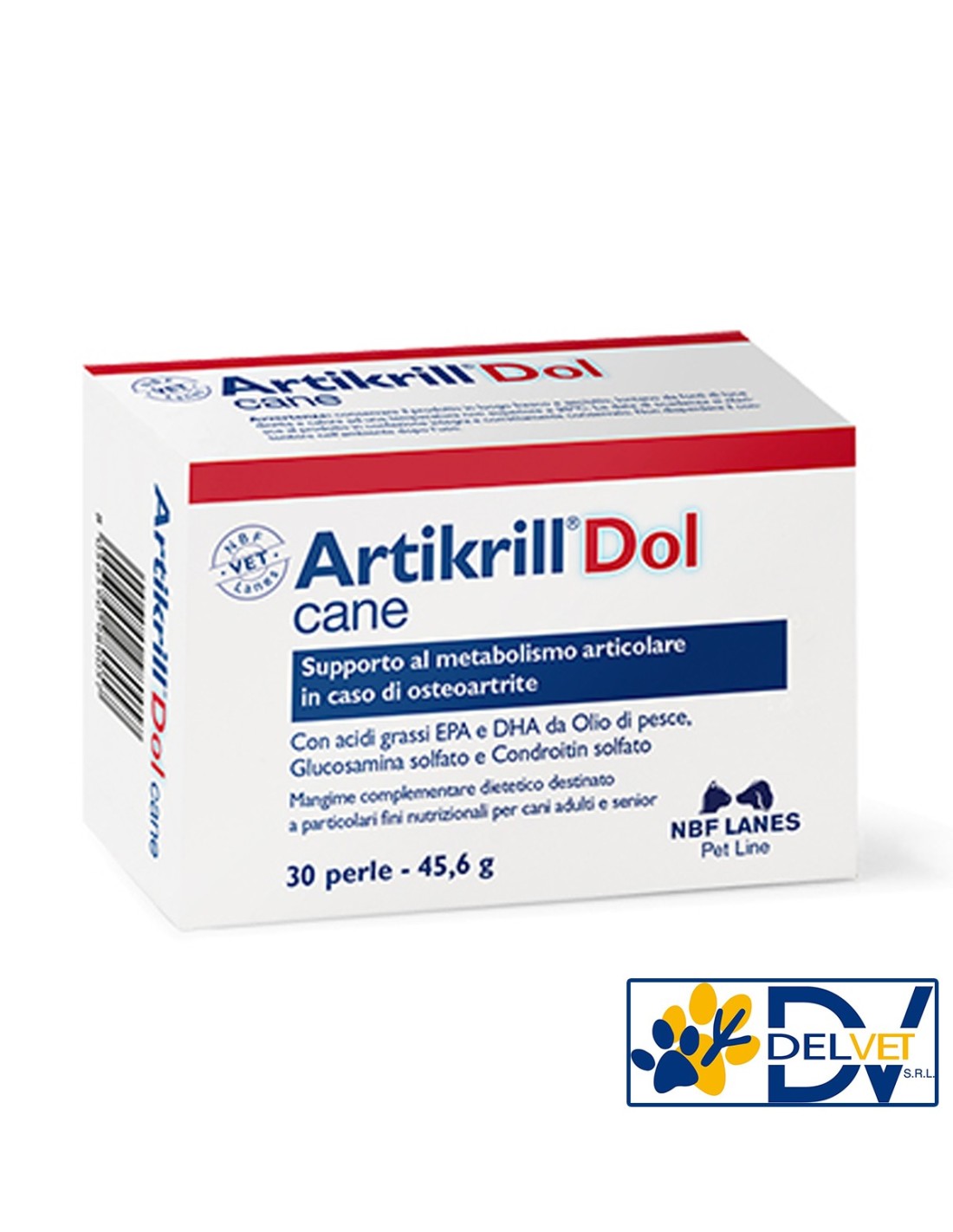 NBF Lanes - ARTIKRILL DOL 200 PERLE CANE è un mangime complementare dietetico con particolari fini nutrizionali per il supporto del metabolismo articolare in caso di osteoartrite del cane.