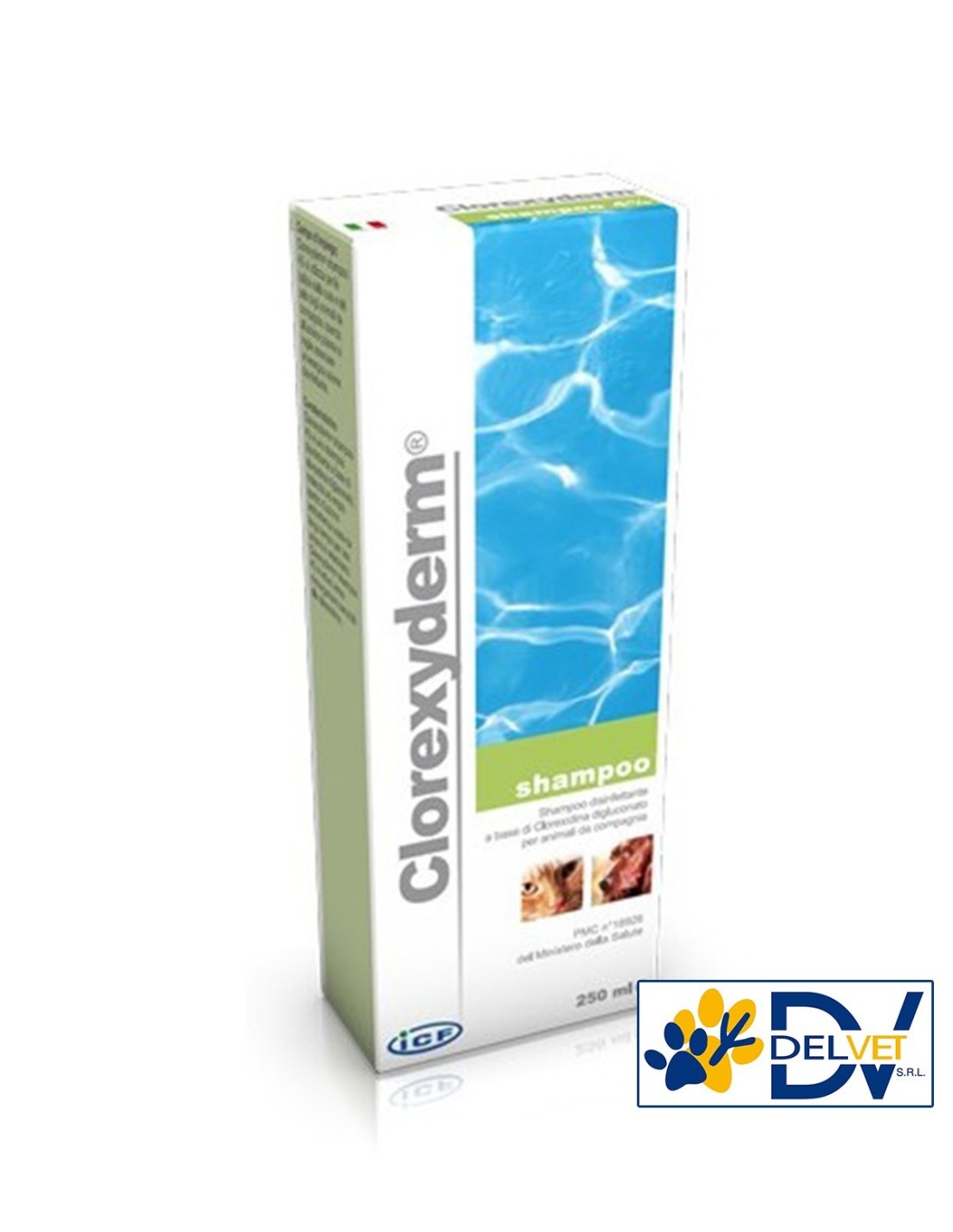 ICF - CLOREXYDERM SHAMPOO 250 ML si impiega per la pulizia del pelo dei cani e dei gatti quando all’azione pulente si voglia associare un’energica azione disinfettante della cute.