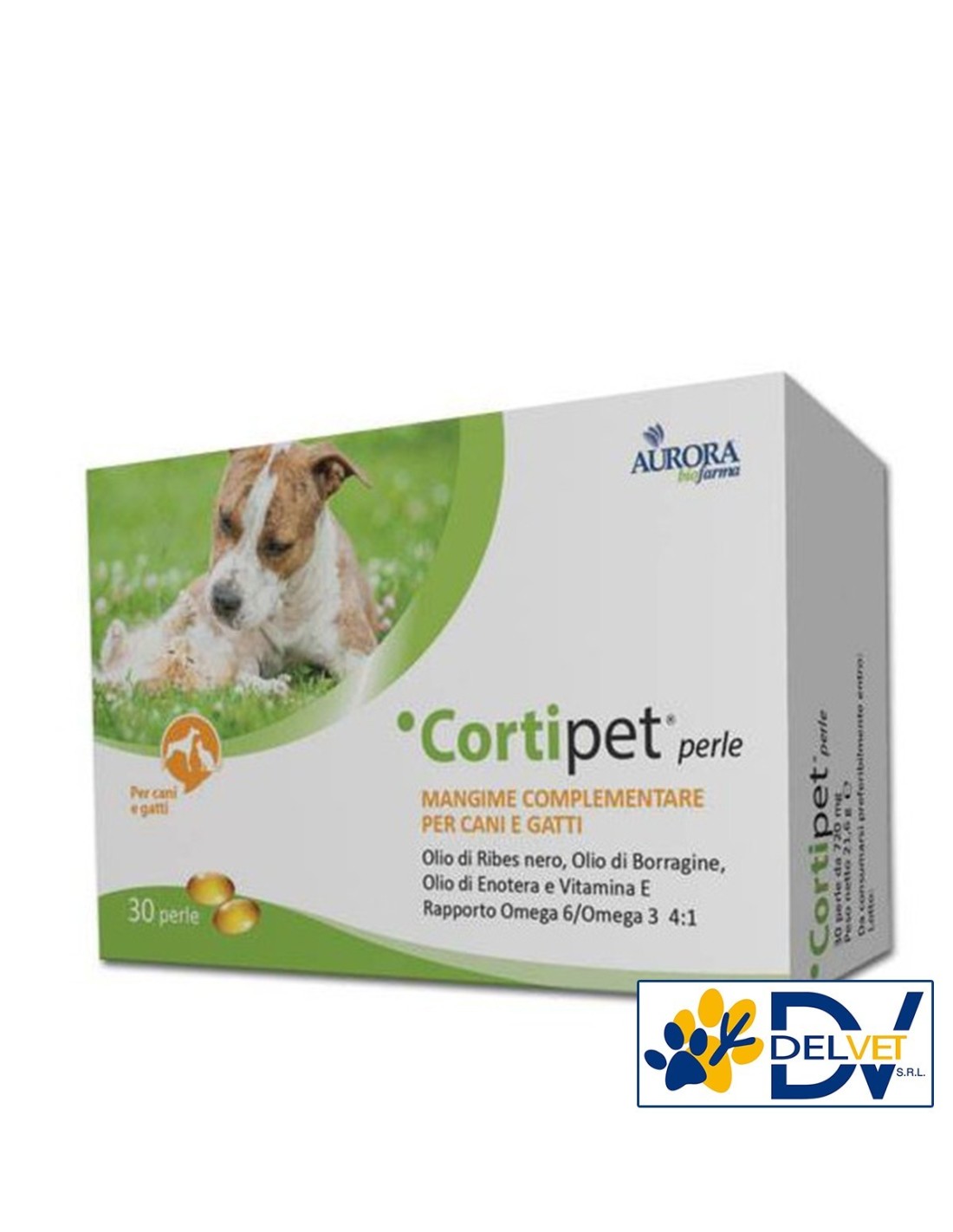 Aurora Biofarma - CORTIPET 30 PERLE è un'associazione unica di Oli di Borragine, Enotera, Ribes nero e Vitamina E, per il trattamento delle affezioni di cute e mantello (dermatiti, prurito, pelo spento e opaco)
