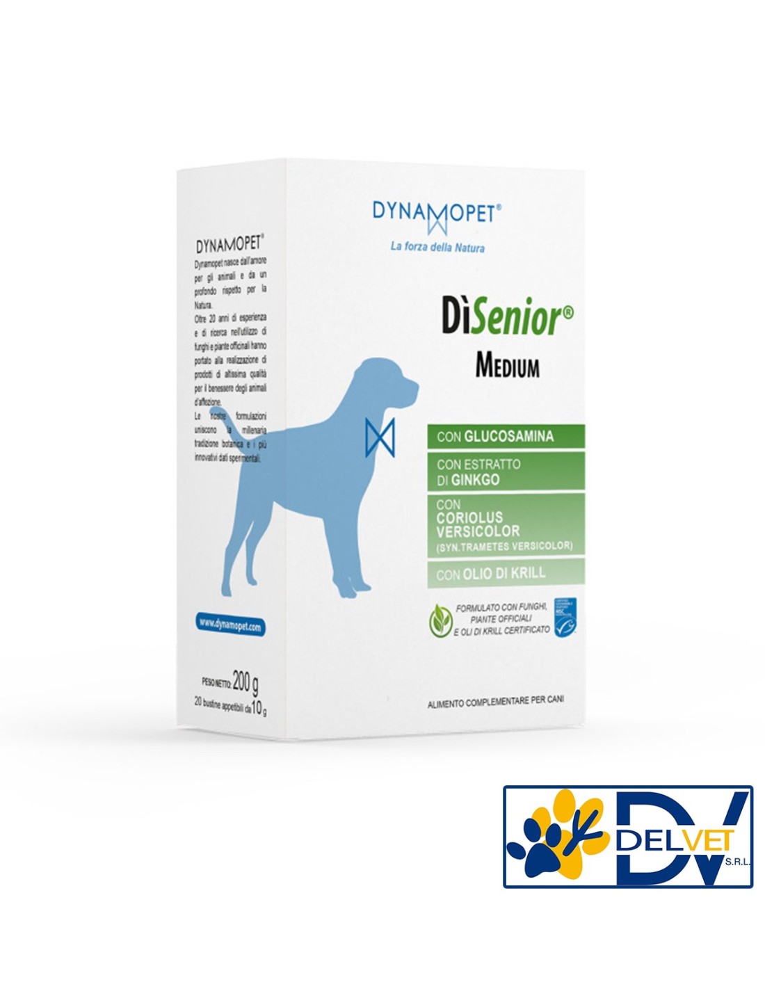 Dynamopet - DISENIOR MEDIUM 20 BUSTINE 10 GR è un alimento complementare sviluppato per favorire un invecchiamento di successo nel cane.