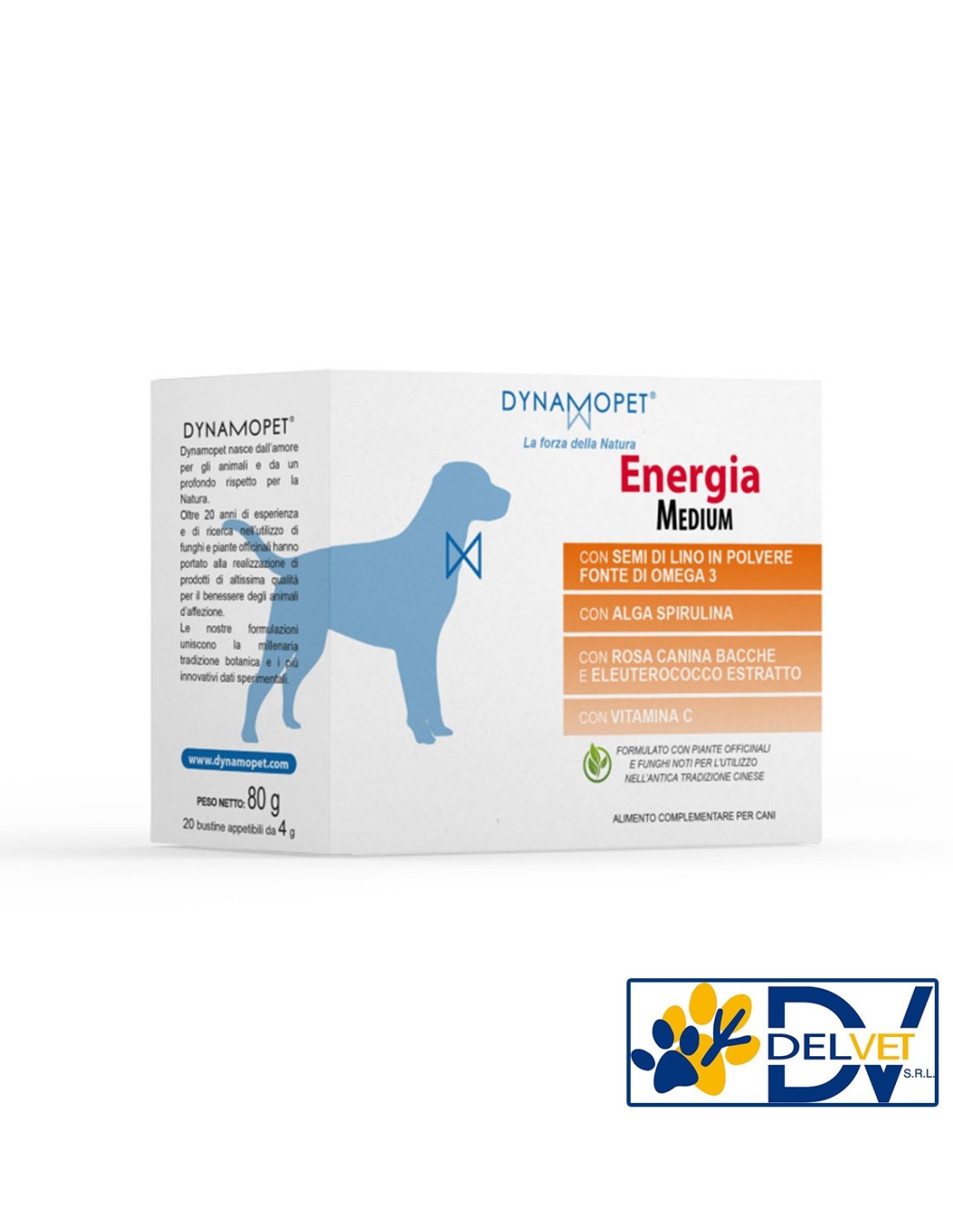 Dynamopet - ENERGIA MEDIUM 20 BUSTINE 4 GR è un alimento complementare sviluppato per animali sportivi, sostiene le fisiologiche funzioni dell’organismo durante i periodi di intenso lavoro e stress psico-fisico.