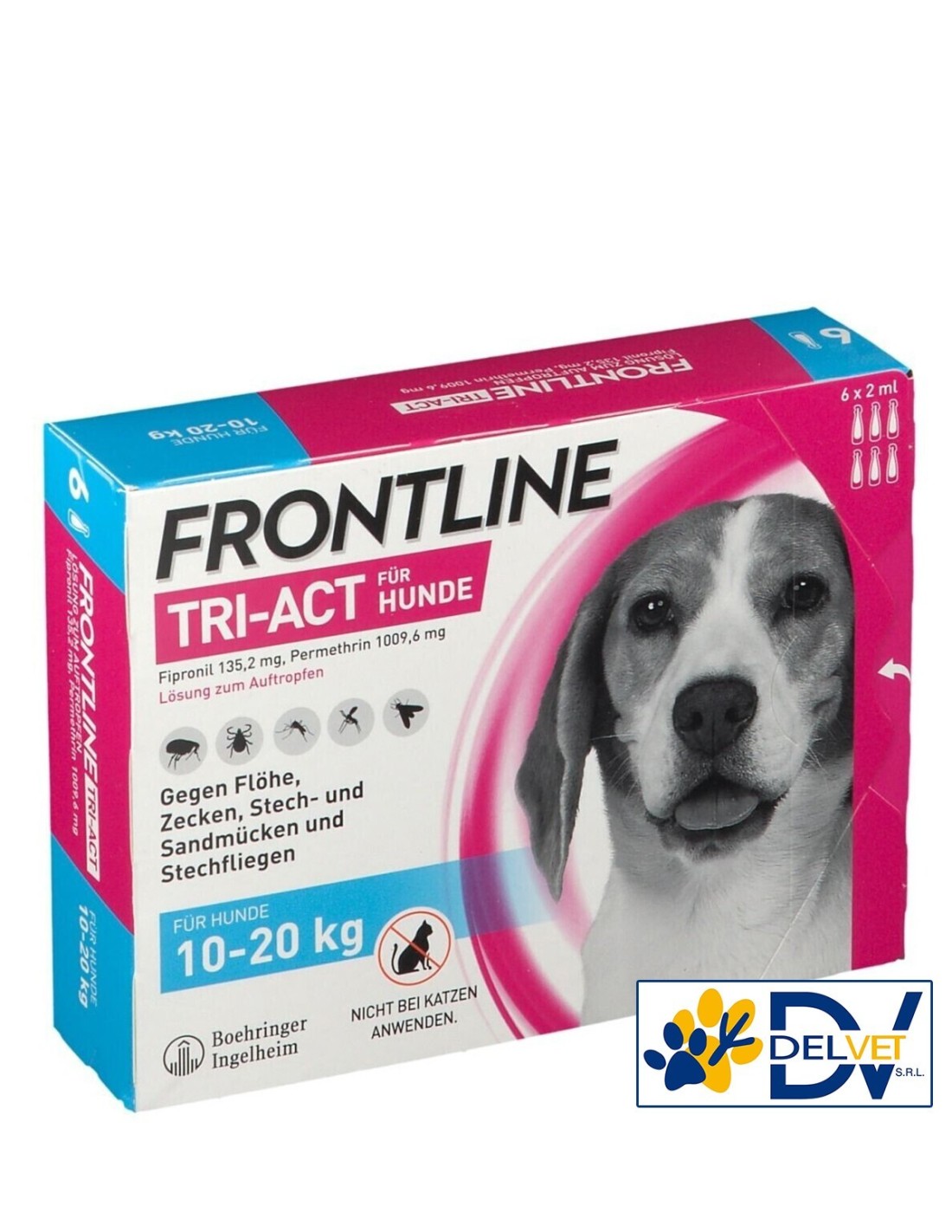 FRONTLINE TRI-ACT CANE TAGLIA M DA 10 A 20 KG 6 PIPETTE flebotomi e mosche cavalline. La combinazione dei due principi attivi di Frontline Tri-Act, fipronil e permetrina, esercita non solo un’azione preventiva nei confronti delle infestazioni da pulci e/o zecche, ma anche insetticida nei confronti di flebotomi, mosche cavalline e/o zanzare, vettori della leishmaniosi.