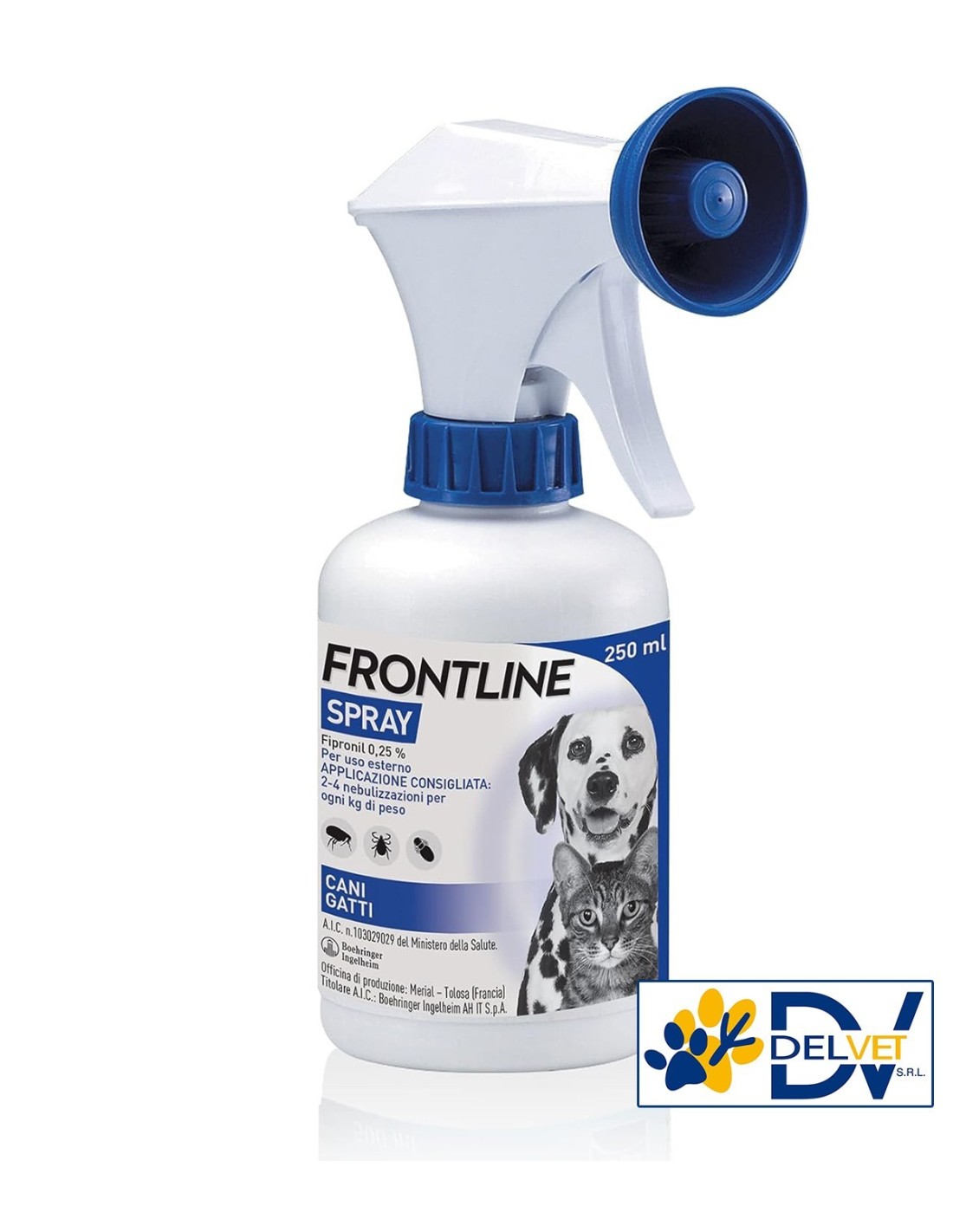 FRONTLINE SPRAY 250 ML è un antiparassitario per cani e gatti, perfetto per eliminare dal manto dell’animale pulci, zecche e pidocchi.