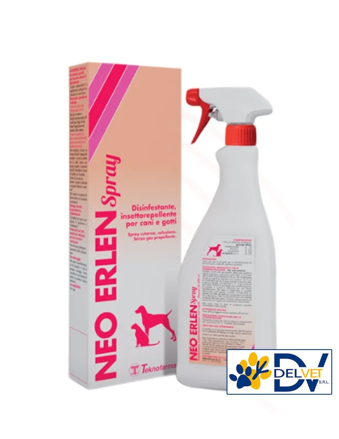Teknofarma - NEO ERLEN SPRAY 500 ML è uno spray cutaneo, soluzione disinfestante, insettorepellente contro Pulci, pidocchi, zecche, zanzare a base di Fenotrina, Tetrametrina, Dietiltoluamide.