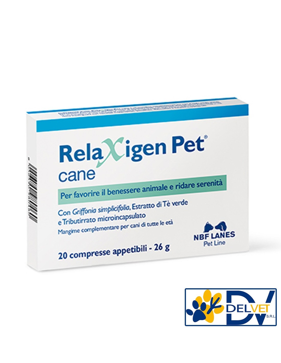NBF Lanes - RELAXIGEN PET CANE 20 COMPRESSE è un mangime complementare per cani di tutte le età con Griffonia simplicifolia, Estratto di Tè verde e Tributirrato microincapsulato.