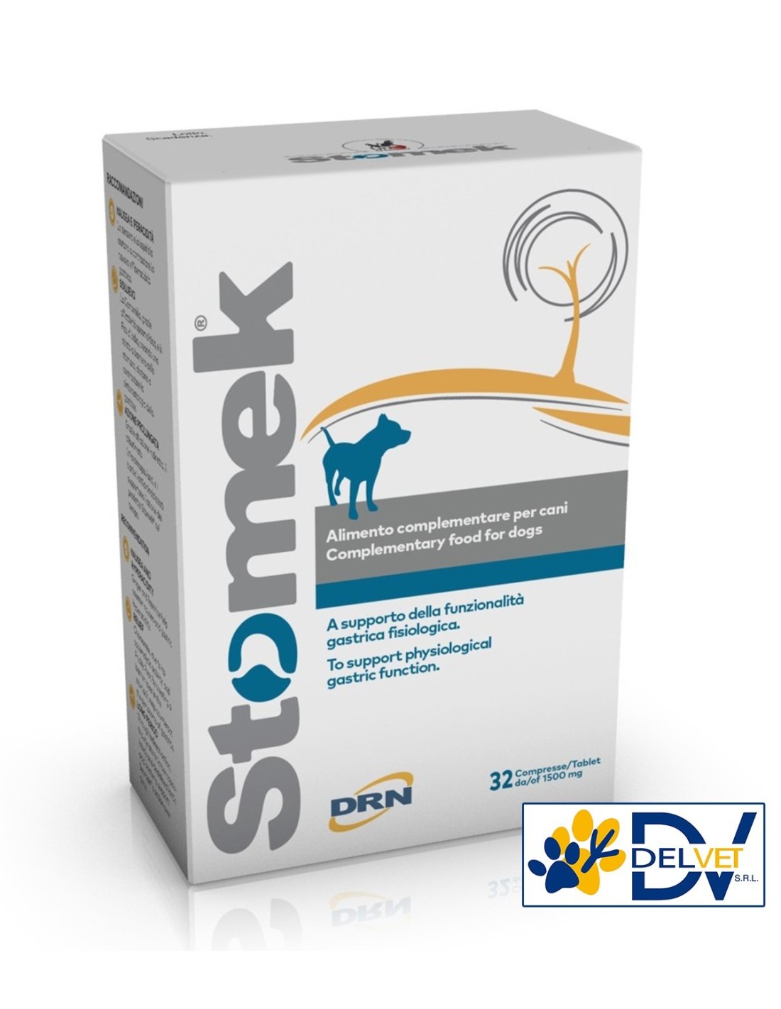 Drn - STOMEK 32 COMPRESSE è un alimento complementare per cani a supporto della funzionalità gastrica fisiologica.