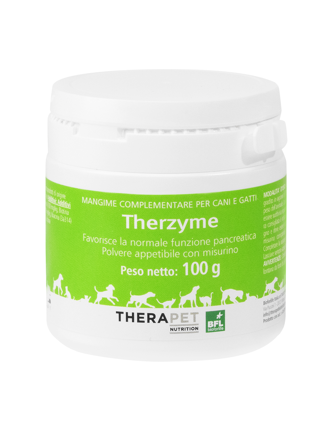 THERZYME THERAPET E' UN MANGIME COMPLEMENTARE FORMULATO CON POLVERE DI PANCREAS, FONTE NATURALE DI ENZIMI DIGESTIVI (LIPASI, AMILASI, PROTEASI, TRIPSINA, CHEMOTRIPSINA), PER FAVORIRE LA NORMALE FUNZIONE PANCREATICA NEL CANE E NEL GATTO DI OGNI ETA'.