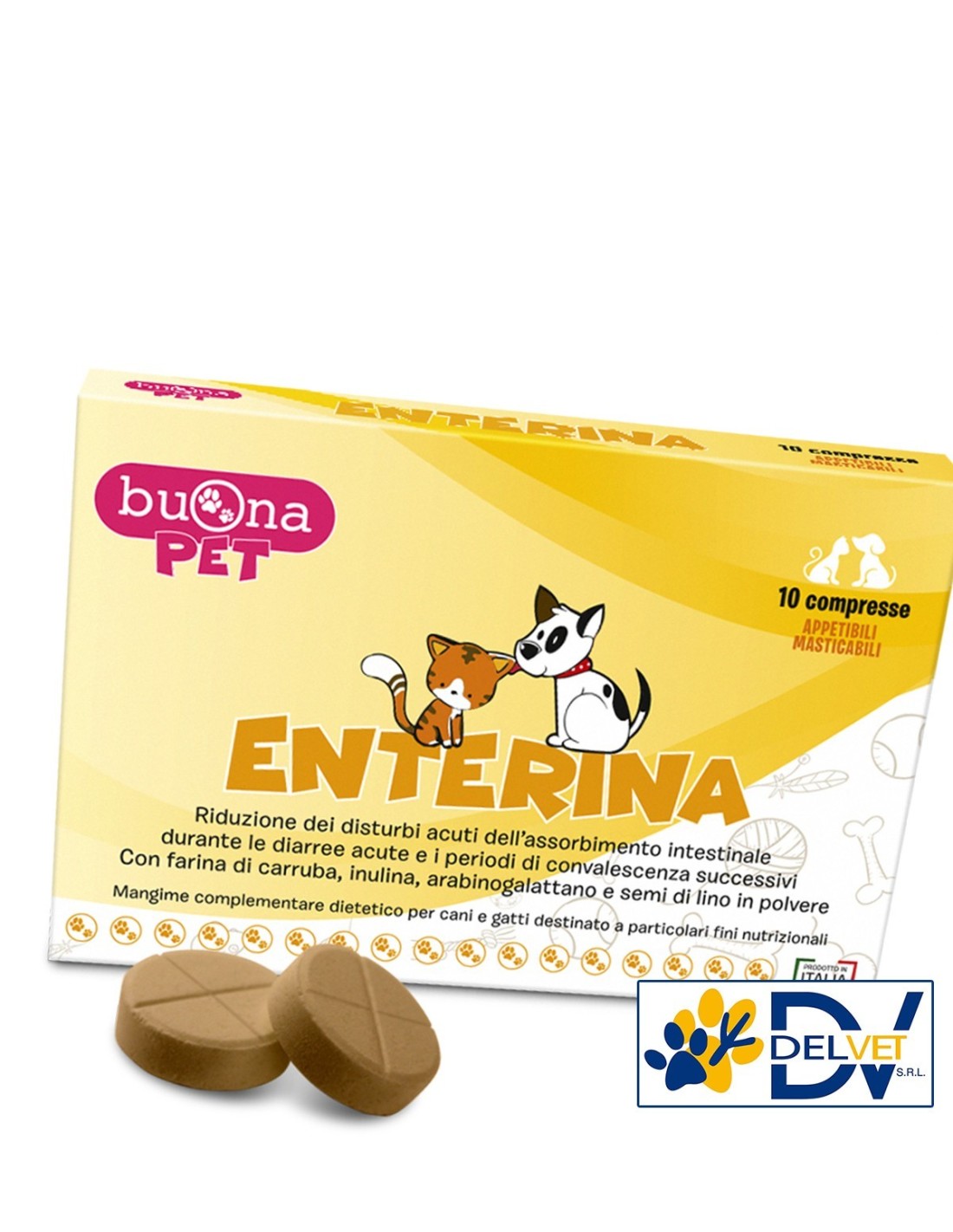 Buona Pet - ENTERINA 10 CPR è un mangime complementare dietetico per cani e gatti destinato a particolari fini nutrizionali formulato in compresse appetibili masticabili.