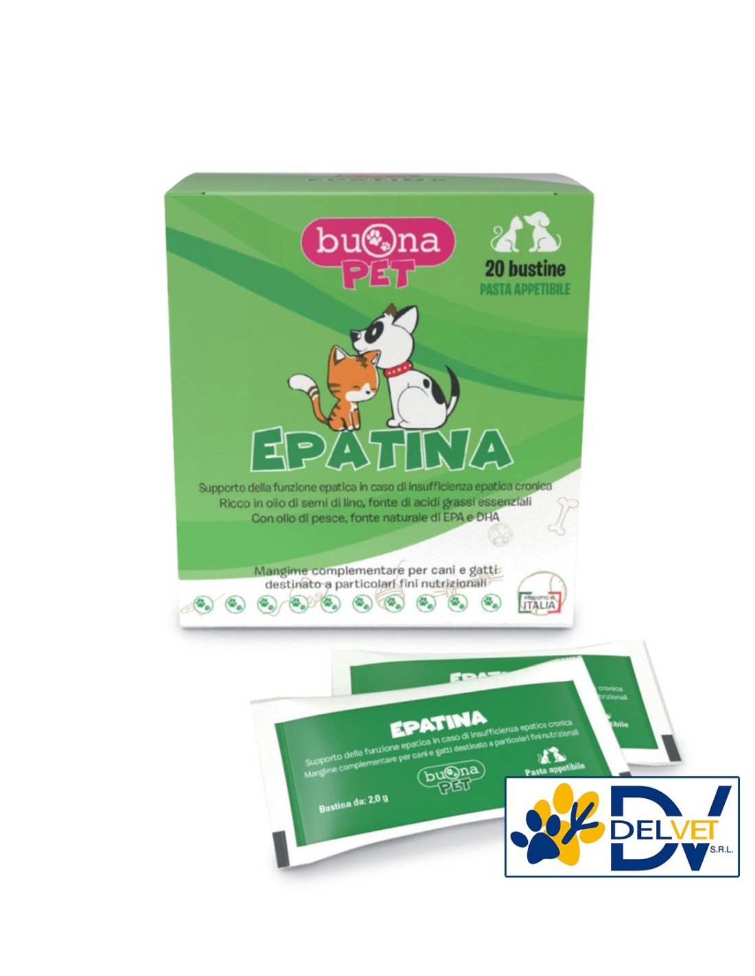 Buona PET - EPATINA 20 BUSTINE è formulato in pasta appetibile ad alta concentrazione di acidi grassi essenziali, con fonti proteiche, Carboidrati di elevata digeribilità, Olio di pesce ed estratto di Cardo mariano (Sylimarin Phytosome® Indena-Milano) per supportare la funzione del fegato in corso di disfunzioni epatiche.