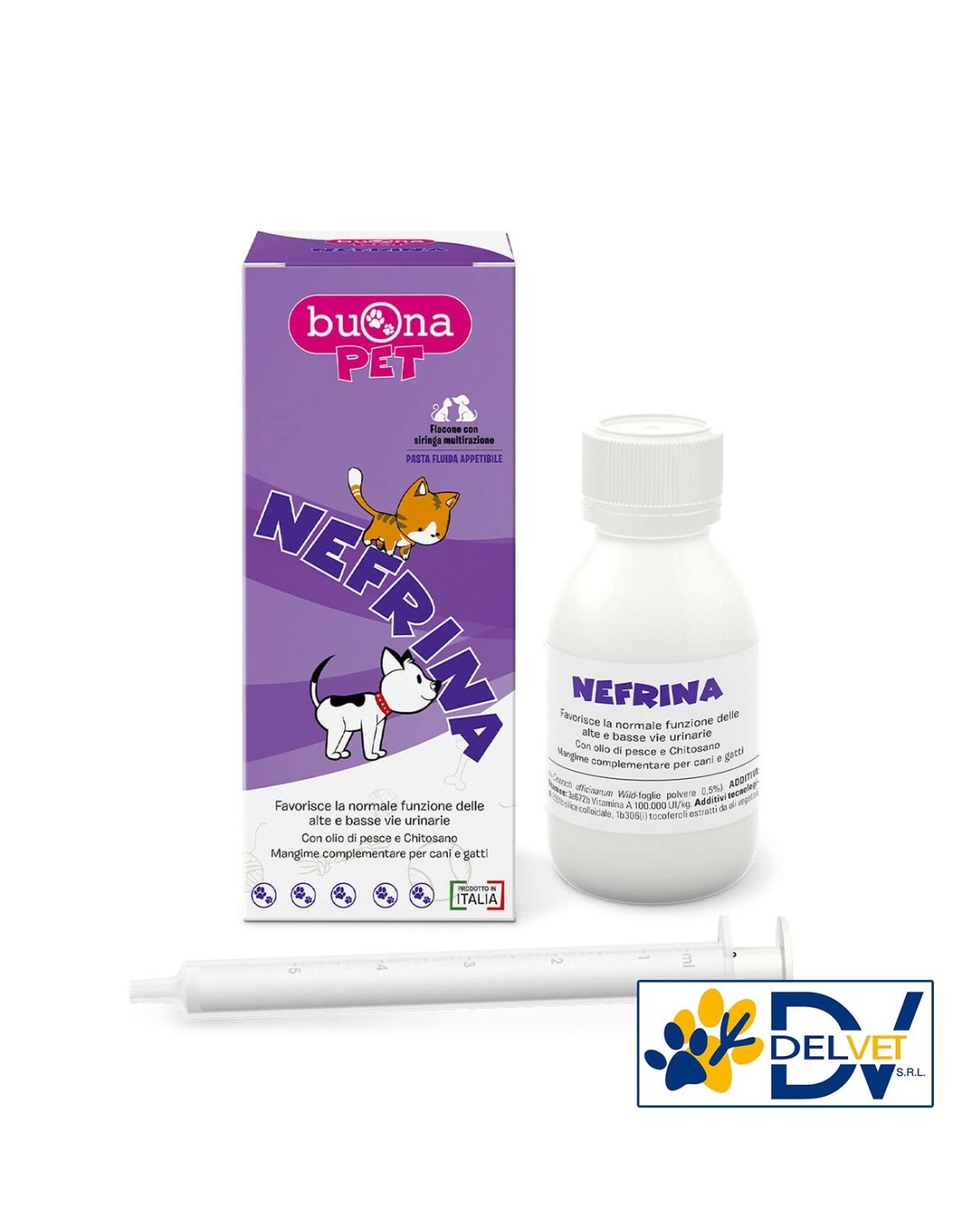 Buona Pet - NEFRINA FLACONE 60 GR è un mangime complementare per cani e gatti formulato in pasta fluida appetibile con olio di pesce fonte di EPA e DHA, chitosano e vitamina A per supportare la normale funzione renale e dell’apparato urinario. L’utilizzo della siringa multirazione consente un’accurata e facile somministrazione quotidiana.