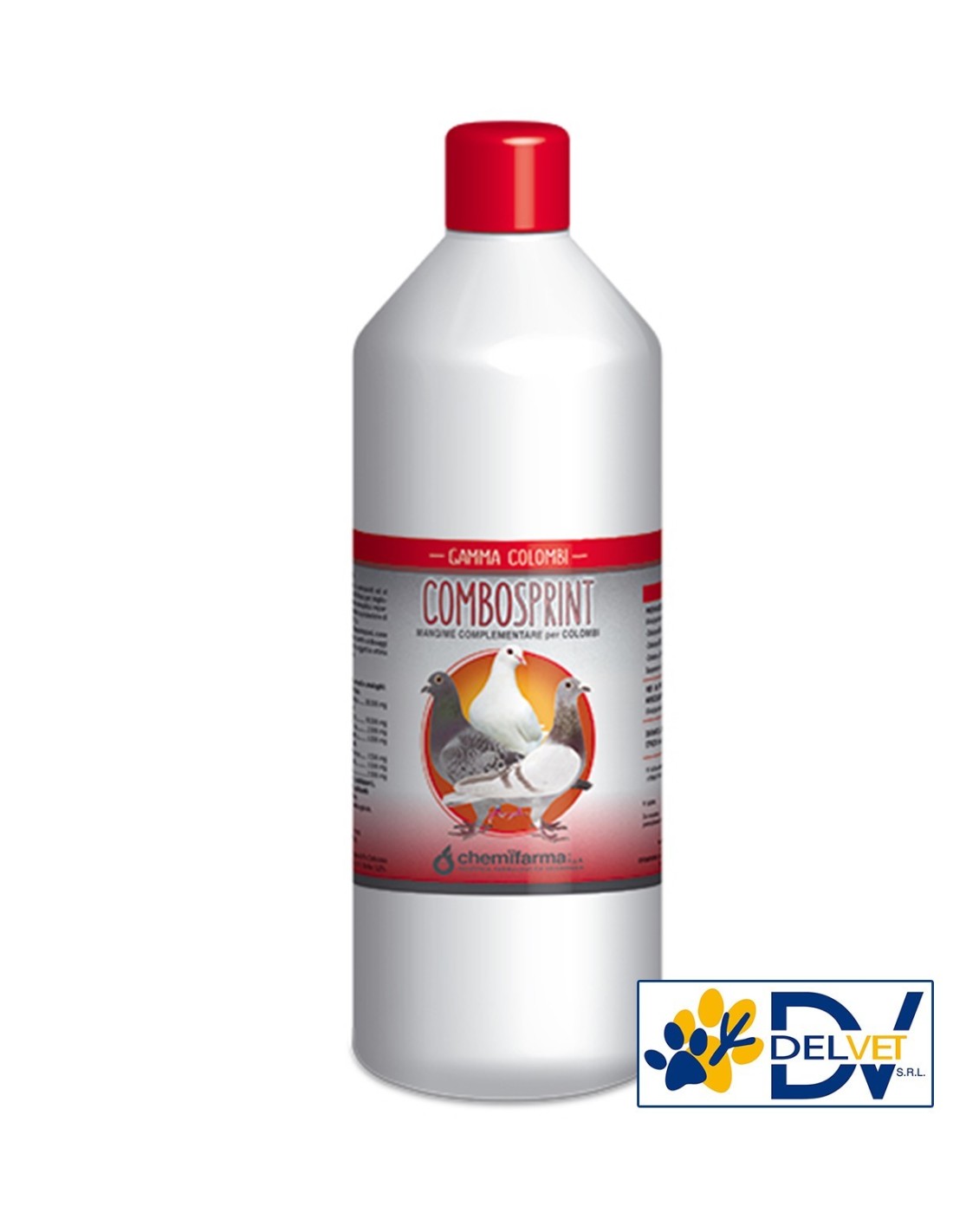 additivi per kg Chemifarma - COMBO SPRINT 1 LT COLOMBI: Vitamina E 5.000 mg, Niacinamide 150 mg, Vitamina B[6:1] 5.000 mg, Vitamina B2 2.000 mg, Vitamina B[6:6] 1.500 mg, Vitamina B[6:12] 30 mg, D-Pantenolo 1.000 mg, Acido Folico 100 mg, L-Carnitina 80.000 mg, DL-Metionina 30.000 mg, L-Lisina 10.000 mg, L-Treonina 2.000 mg, L-Arginina 5.000 mg, Acido L-Glutammico 1.500 mg, Acido aspartico 1.500 mg, Glicina 2.000 mg. Emulsionanti ed eccipienti qb a 1000 ml
