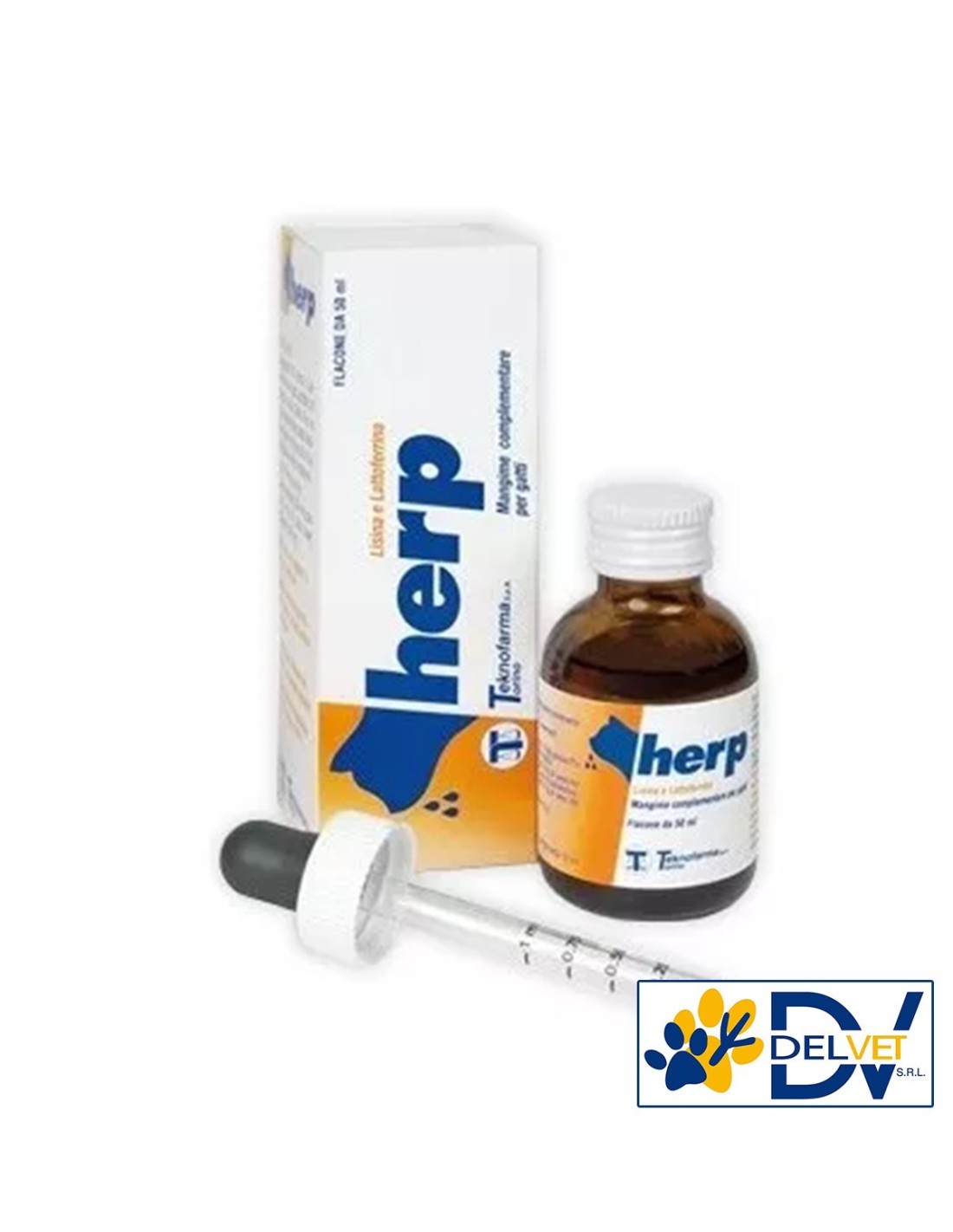 Teknofarma - HERP 50 ML mangime complementare utilizzato per integrare la dieta in Lattoferrina e Lisina nei gatti soggetti a pressione infettiva (come ad esempio nei portatori di Herpes Virus e Calici Virus) al primo manifestarsi della sintomatologia e nei periodi di riacutizzazione della medesima.