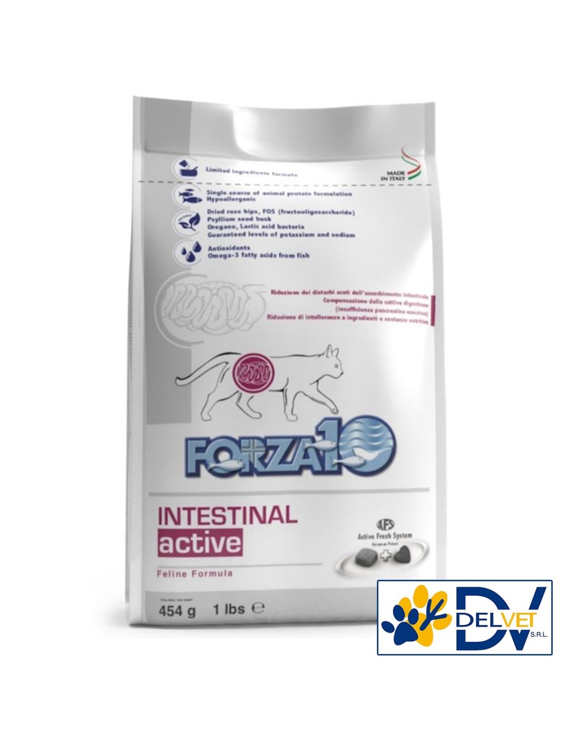 Forza 10 - GATTO INTESTINAL ACTIVE 454 GR è un alimento dietetico completo per gatti adulti per la riduzione dei disturbi dell’assorbimento intestinale e la compensazione della cattiva digestione.