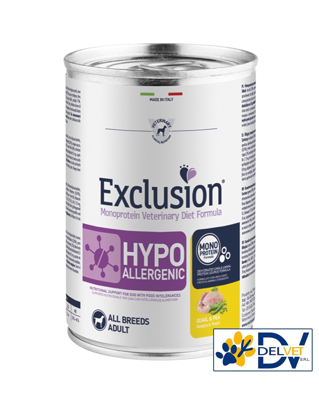 EXCLUSION HYPOALLERGENIC QUAIL & PEA 400 GR è un alimento completo dietetico per cani adulti formulato per la riduzione di intolleranze a ingredienti e a sostanze nutritive.