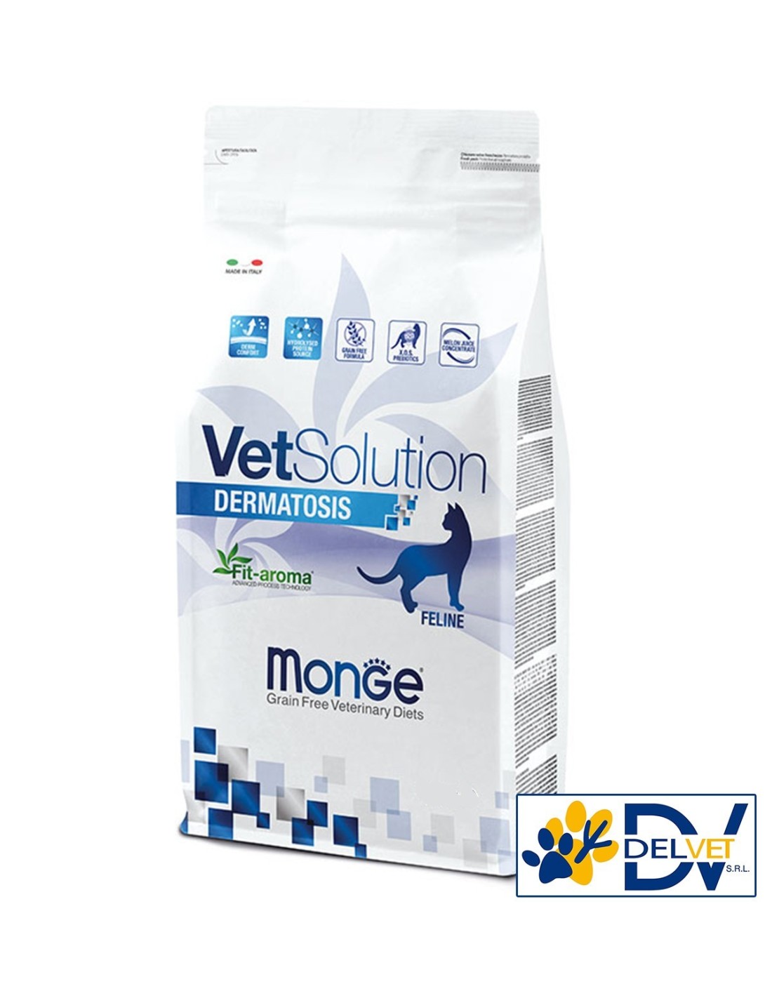 MONGE VETSOLUTIONS DERMATOSIS GATTO 1,5 KG è un alimento dietetico completo per gatti formulato per il supporto della funzione dermica in caso di dermatosi ed eccessiva perdita di peli.