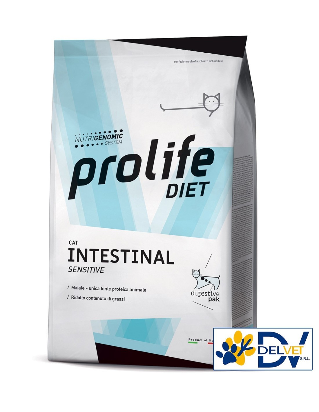 PROLIFE INTESTINAL SENSITIVE GATTO 300 GR è un alimento completo dietetico per il gatto formulato per la compensazione della cattiva digestione, la riduzione dei disturbi dell’assorbimento intestinale e il supporto al metabolismo dei lipidi in caso di iperlipidemia