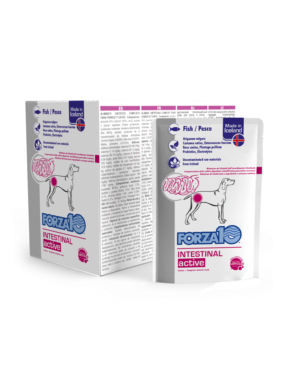 Intestinal al pesce è un alimento dietetico umido per cani adulti, completo e bilanciato, per la riduzione dei disturbi dell’assorbimento intestinale e la compensazione della cattiva digestione.