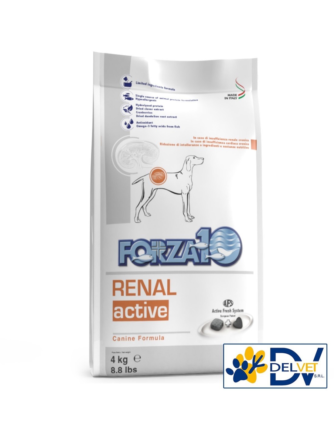 Forza 10 - CANE RENAL ACTIVE 4 KG è un alimento dietetico completo per cani adulti per il supporto della funzione renale in caso di insufficienza renale cronica.