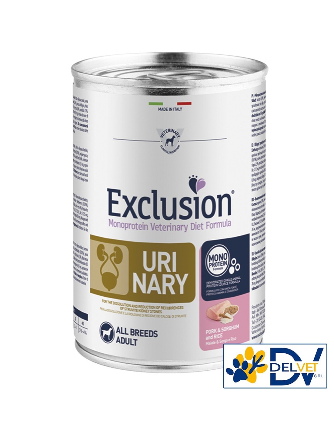 EXCLUSION URINARY PORK & SORGHUM AND RICE 200 GR è un alimento completo dietetico formulato per la dissoluzione di calcoli a base di struvite e per la riduzione di recidive dei calcoli di struvite. Questo alimento dietetico ha proprietà acidificanti dell’urina, una bassa concentrazione di magnesio e ridotto tenore di proteine di alta qualità.