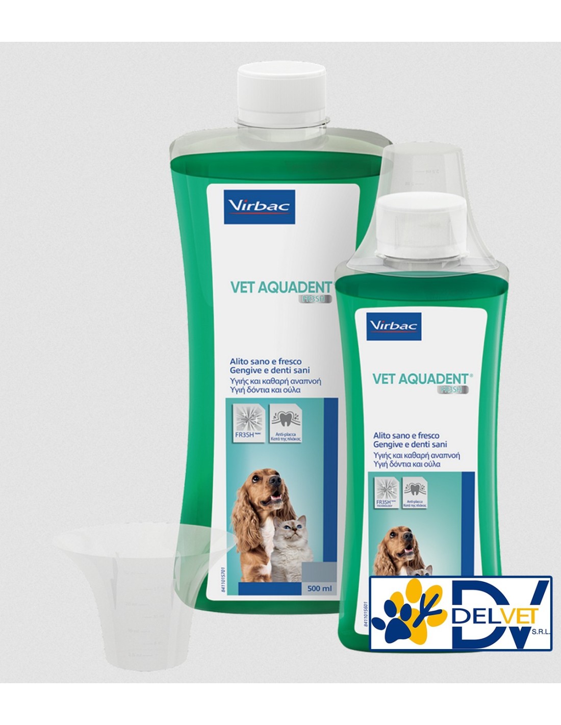 VIRBAC VET AQUADENT FR3SH 250 ML è una soluzione progettata dai veterinari per l'igiene orale quotidiana di cani e gatti. Aggiunta all'acqua da bere, aiuta a mantenere l'alito fresco, i denti e le gengive sani, controllando la placca.