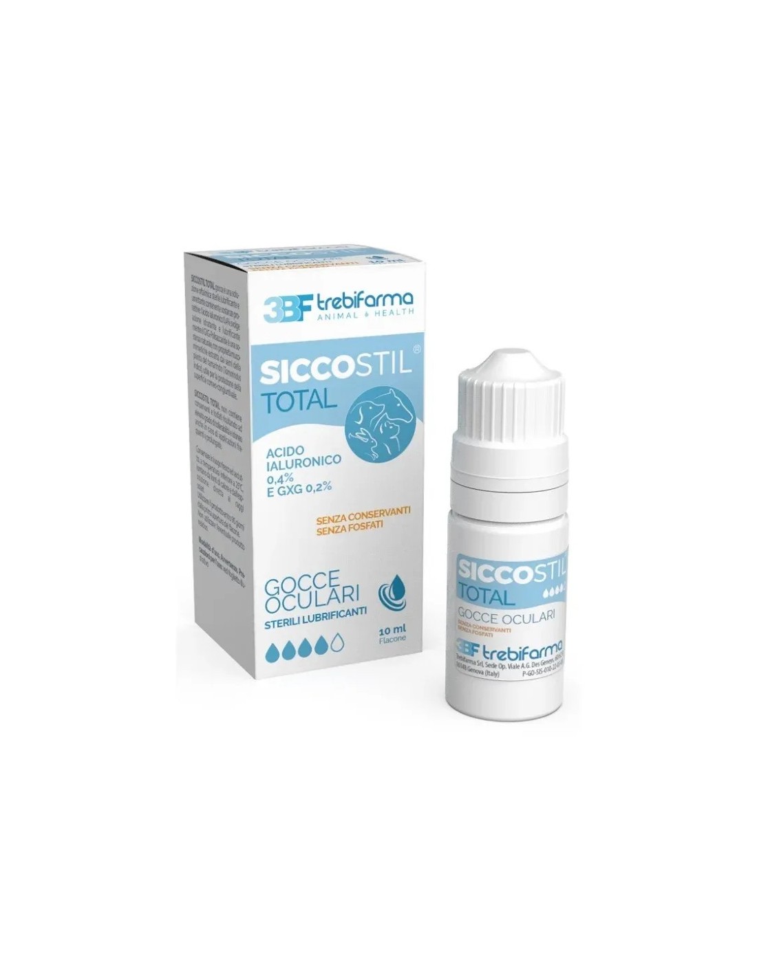 Siccostil total gocce oculari è una soluzione oftalmica senza conservanti e senza fosfati indicata per cani, gatti cavalli non DPA e conigli d'affezione.