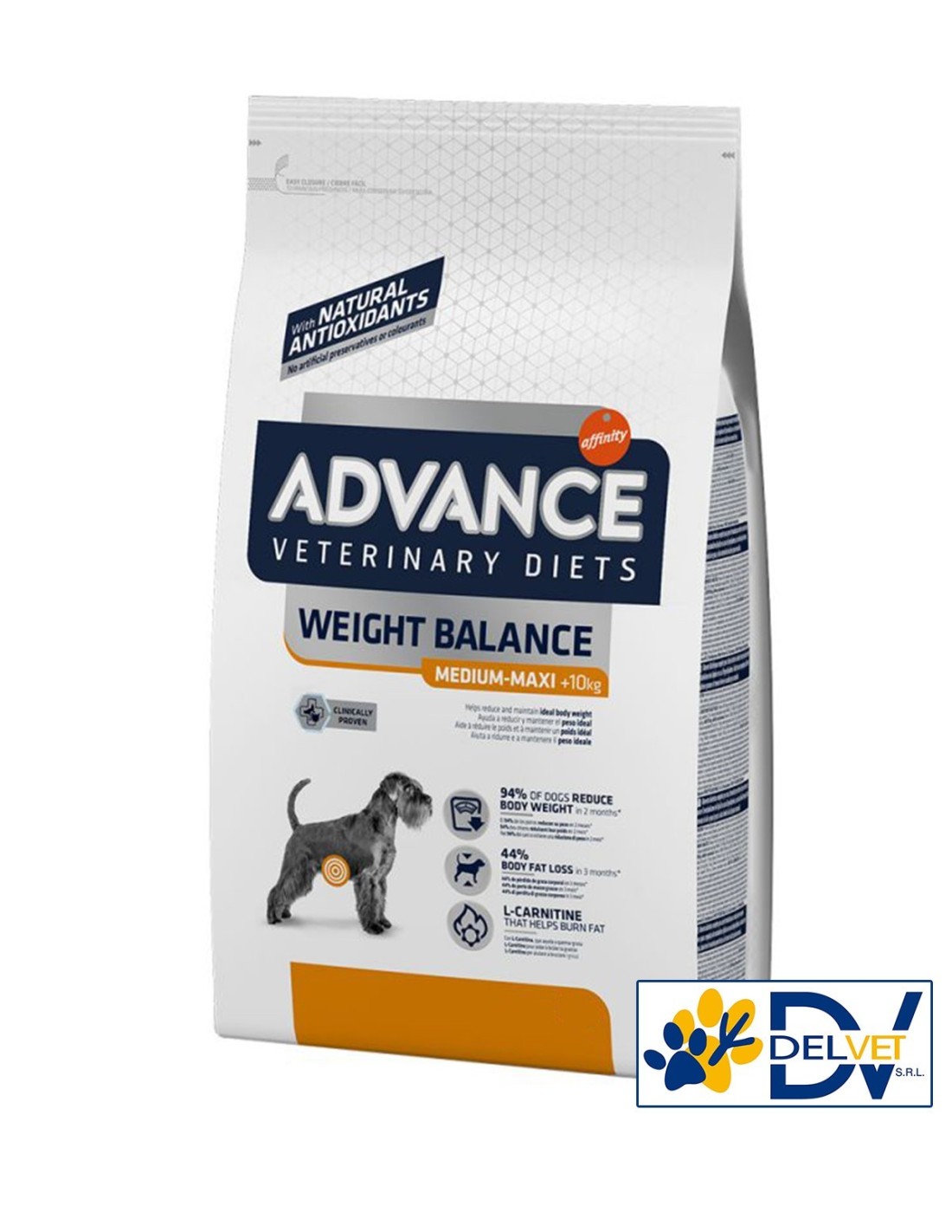 ADVANCE AFFINITY VETERINARY DIETS WEIGHT BALANCE MEDIUM MAXI CANE 3 KG crocchette per cani in sovrappeso. Coaduviano la perdita di peso e regolano il metabolismo dei lipidi in caso di iperlipidemia.