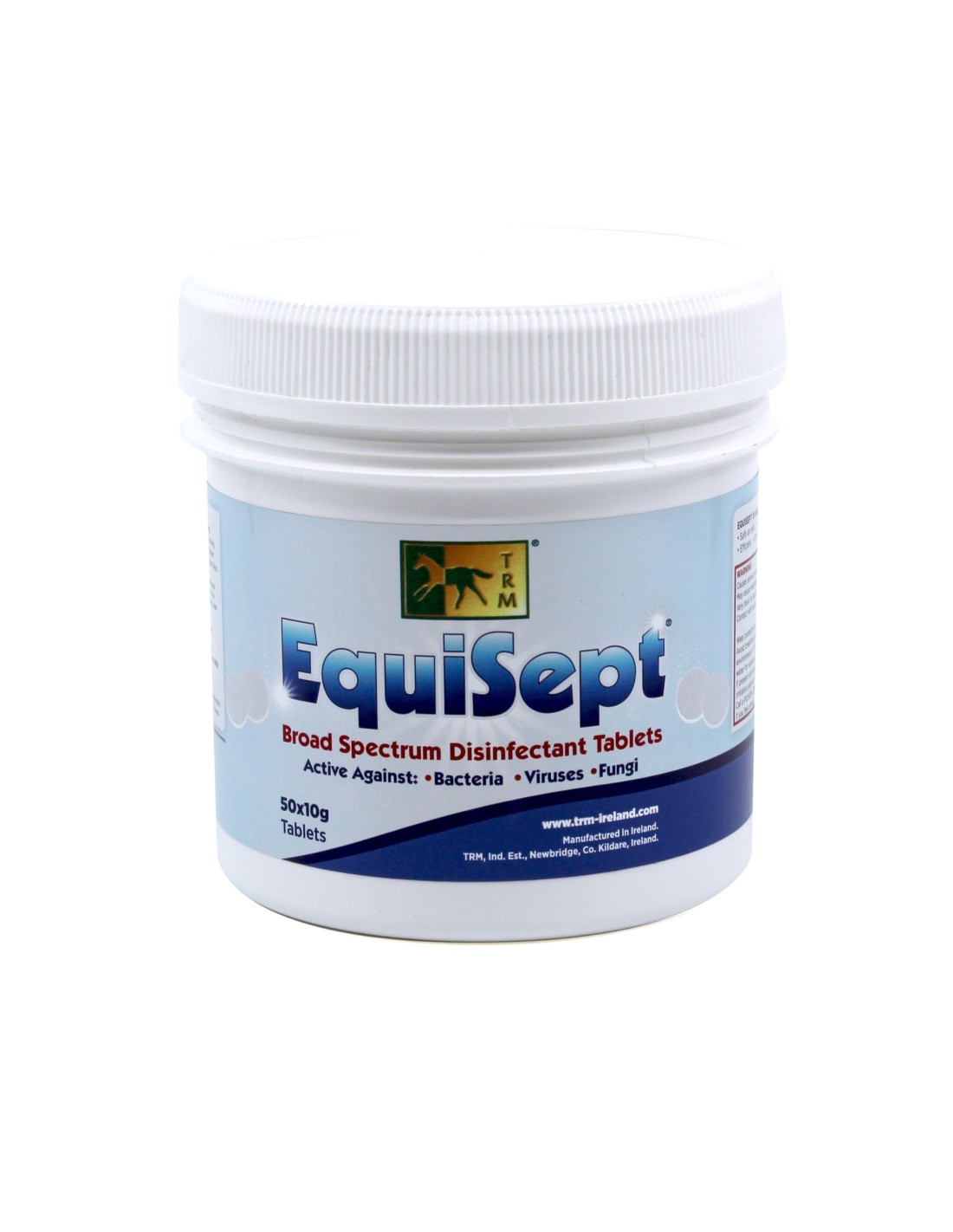 Equisept è in compresse effervescenti da 10gr(conteneti 5gr di Troclosene Sodio(Na DCC) come principio attivo).Equisept è un disinfettante a largo spettro attivo contro batteri,virus e funghi. E’ particolarmente attivo contro le spore fungine :specialmente per lo Aspergillus; molte delle quali causano problemi ai cavalli limitandone le prestazioni.